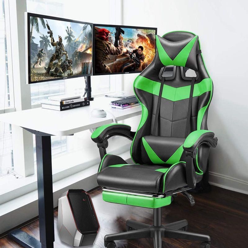 Fotel komputerowy / gamingowy z podnóżkiem – czarno-zielony Fotel gamingowy idealnie wpasuje się do pokoju prawdziwego gracza czy informatyka, gwarantując użytkownikowi najwyższy komfort pracy. Konstrukcja fotela zapewni komfort użytkowania przez długie godziny. Długa praca czy gra nie będzie więcej obciążała Twojego kręgosłupa, poduszka w odcinku lędźwiowym idealnie wspiera kręgosłup. Kubełkowy fotel minimalizuje zmęczenie, daje oparcie dla głowy, karku oraz dla nóg. Cechy fotela: Wyprofilowany fotel pozwoli spędzić długie godziny przed komputerem Kubełkowe siedzisko Wysuwany podnóżek Regulacja wysokość siedziska Regulacja pochylenia oparcia: 90˚, 120˚, 135˚, 150˚ Specyfikacja techniczna: Szerokość oparcia: 54-44 cm Wysokość oparcia: 80 cm Szerokość siedziska: 38 cm Całkowita wysokość fotela: 125-133 cm Średnica rozstawu nóg: 70 cm