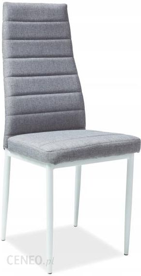 Proste krzesło do jadalni z oparciem przeszywanym w poziome pasy. Całość wykończona w szarej tkaninie osadzonej na malowanym na biało metalowym stelażu.